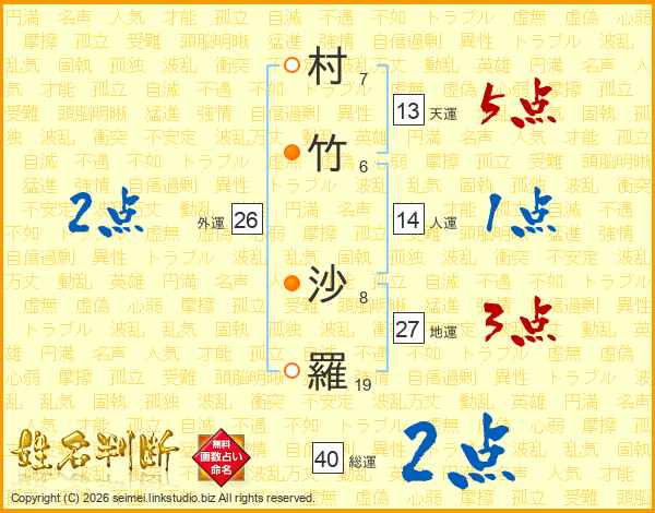 村(7画)竹(6画) 沙(8画)羅(19画)