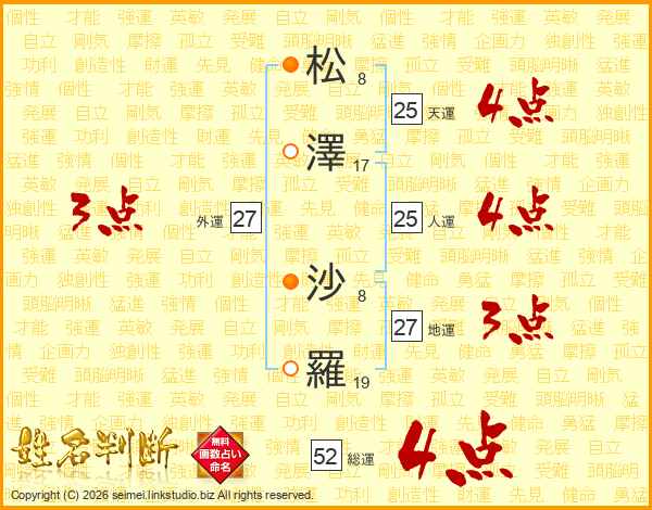 松(8画)澤(17画) 沙(8画)羅(19画)