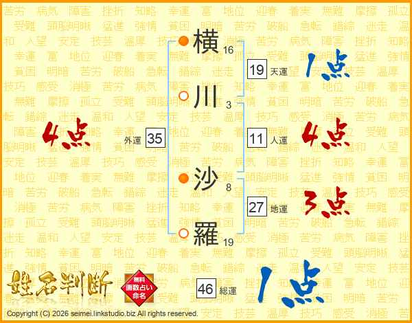 横(16画)川(3画) 沙(8画)羅(19画)