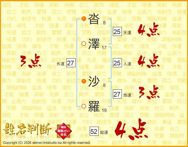 沓(8画)澤(17画) 沙(8画)羅(19画)
