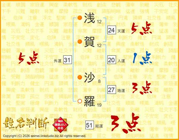 浅(12画)賀(12画) 沙(8画)羅(19画)