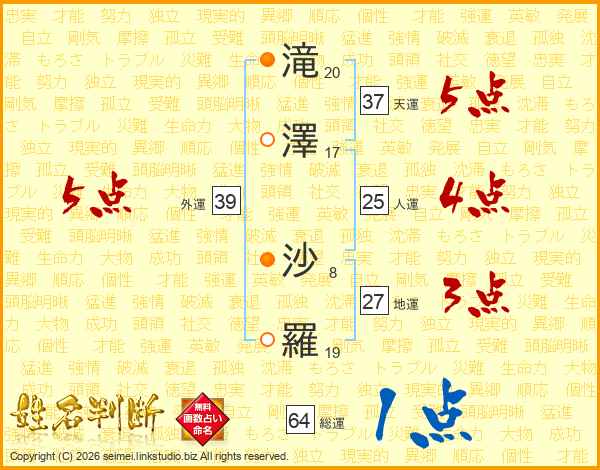 滝(20画)澤(17画) 沙(8画)羅(19画)