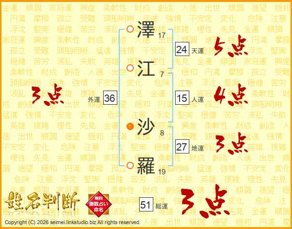 澤(17画)江(7画) 沙(8画)羅(19画)