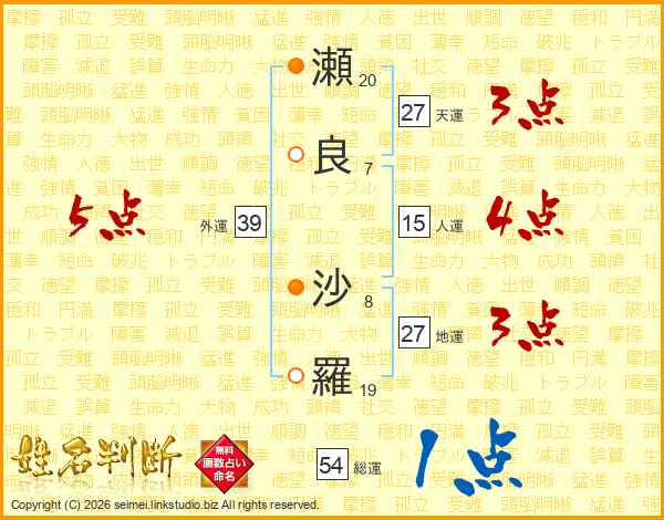 瀬(20画)良(7画) 沙(8画)羅(19画)