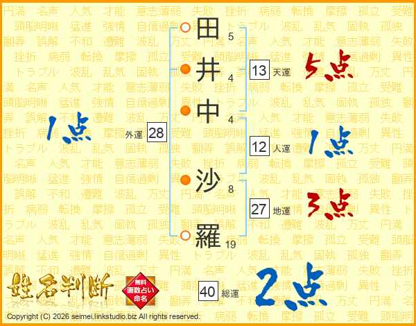 田(5画)井(4画)中(4画) 沙(8画)羅(19画)