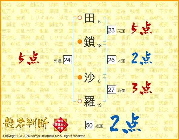 田(5画)鎖(18画) 沙(8画)羅(19画)