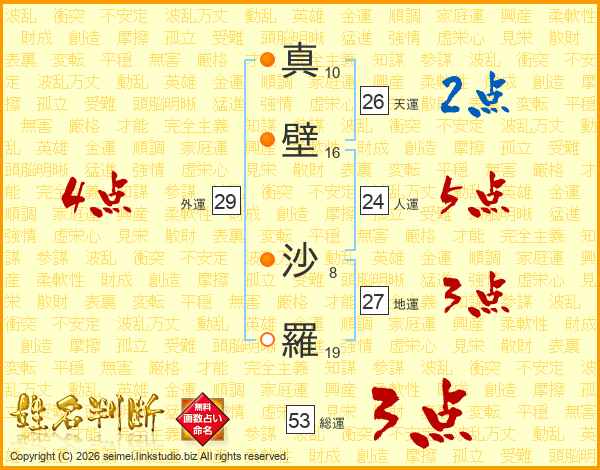 真(10画)壁(16画) 沙(8画)羅(19画)