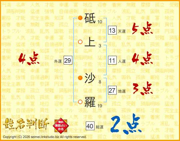 砥上沙羅さんの総運は40画の2点!