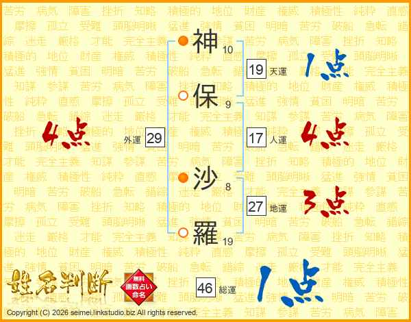 神(10画)保(9画) 沙(8画)羅(19画)