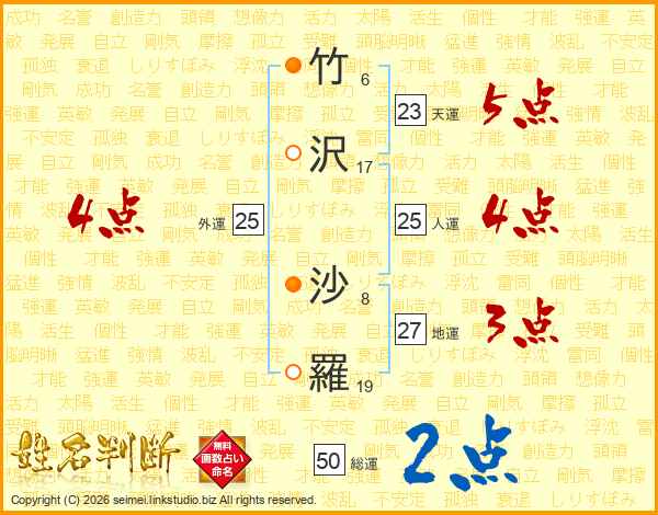 竹(6画)沢(17画) 沙(8画)羅(19画)