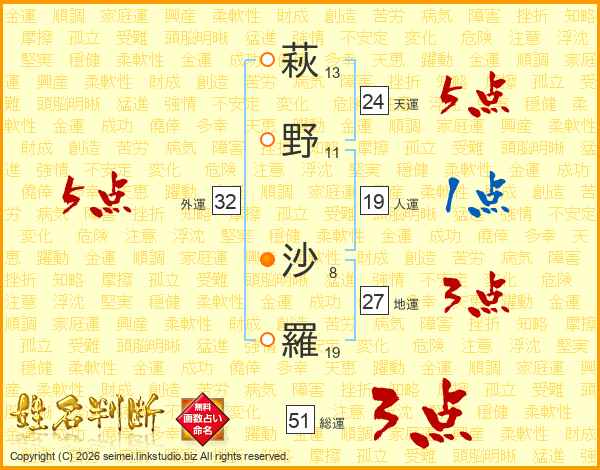 萩(13画)野(11画) 沙(8画)羅(19画)