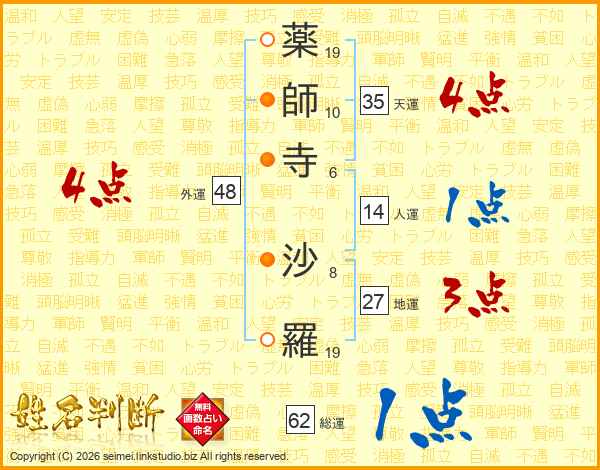 薬(19画)師(10画)寺(6画) 沙(8画)羅(19画)