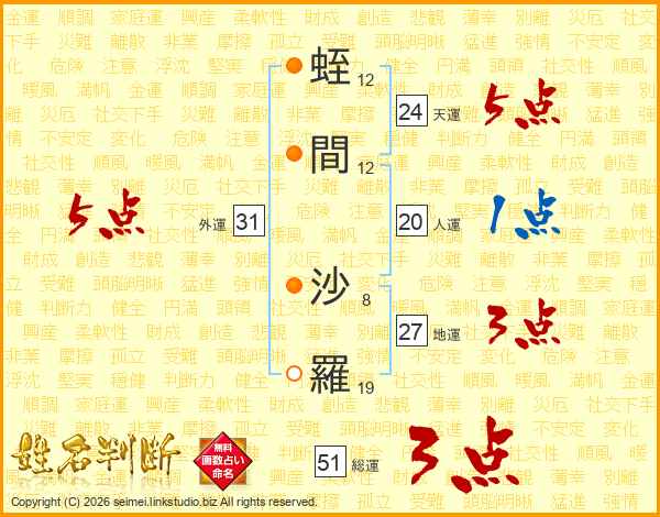 蛭間沙羅さんの総運は51画の3点!