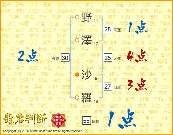野(11画)澤(17画) 沙(8画)羅(19画)