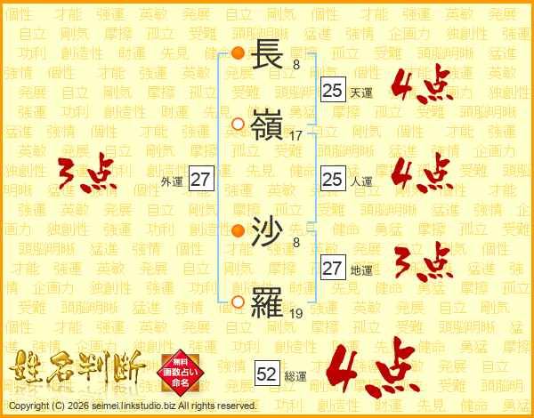 長(8画)嶺(17画) 沙(8画)羅(19画)