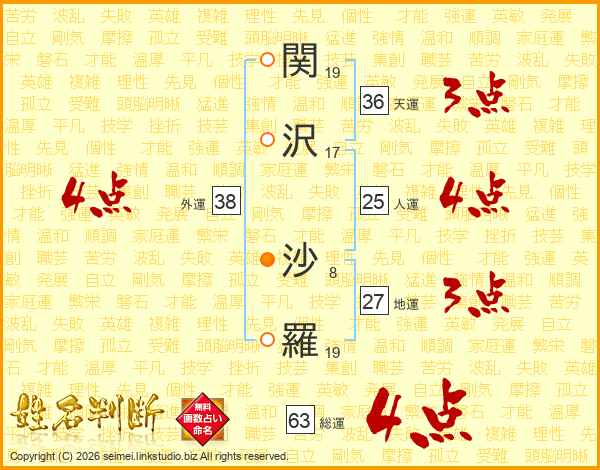 関(19画)沢(17画) 沙(8画)羅(19画)