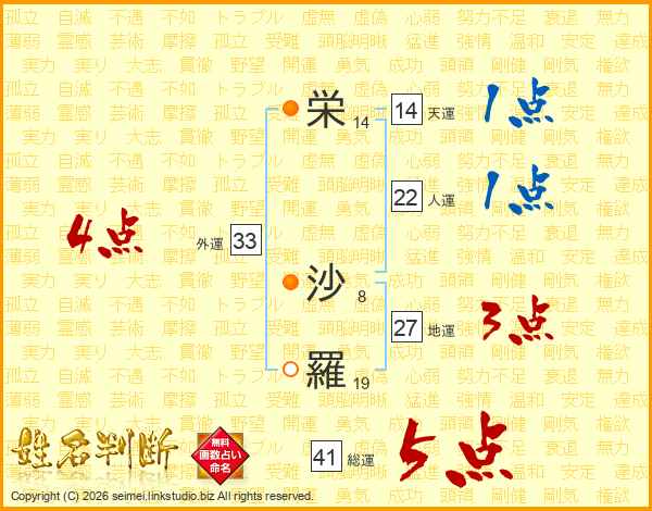 栄(14画) 沙(8画)羅(19画)