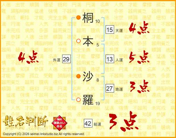 桐(10画)本(5画) 沙(8画)羅(19画)