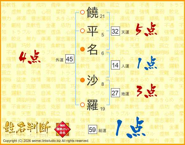 饒(21画)平(5画)名(6画) 沙(8画)羅(19画)