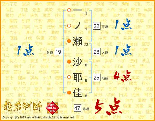 一ノ瀬沙耶佳さんの総運は47画の5点!