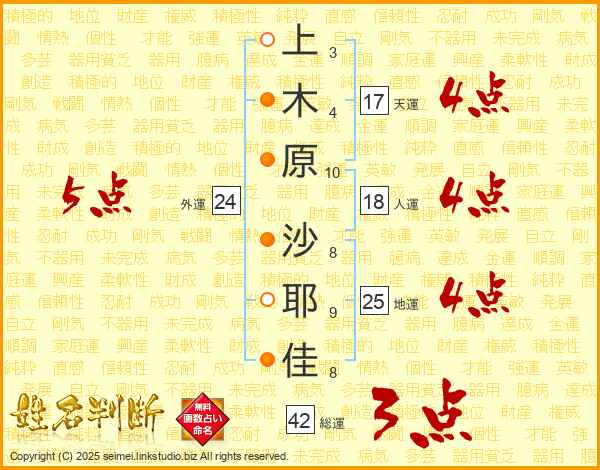 上(3画)木(4画)原(10画) 沙(8画)耶(9画)佳(8画)