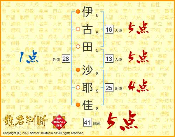 伊(6画)古(5画)田(5画) 沙(8画)耶(9画)佳(8画)