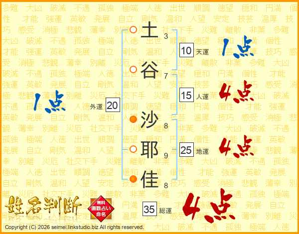 土(3画)谷(7画) 沙(8画)耶(9画)佳(8画)