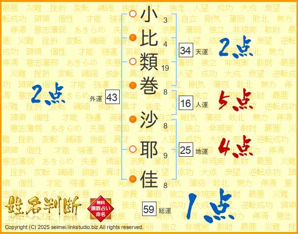小(3画)比(4画)類(19画)巻(8画) 沙(8画)耶(9画)佳(8画)
