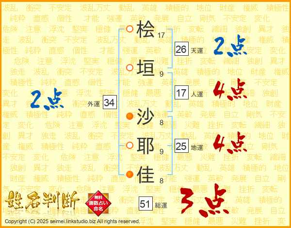 桧(17画)垣(9画) 沙(8画)耶(9画)佳(8画)
