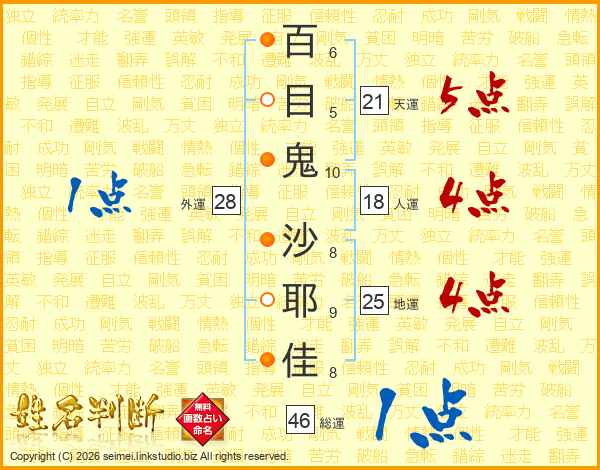百目鬼沙耶佳さんの総運は46画の1点!