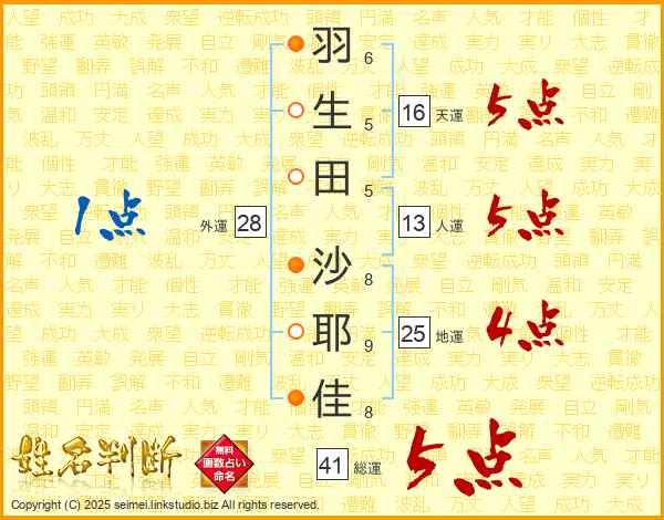 羽(6画)生(5画)田(5画) 沙(8画)耶(9画)佳(8画)