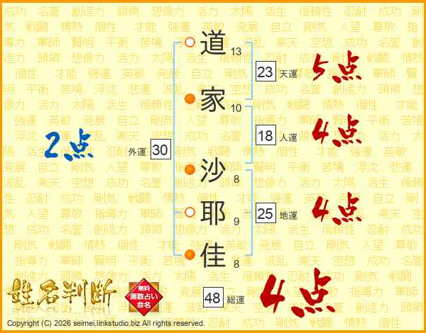 道(13画)家(10画) 沙(8画)耶(9画)佳(8画)