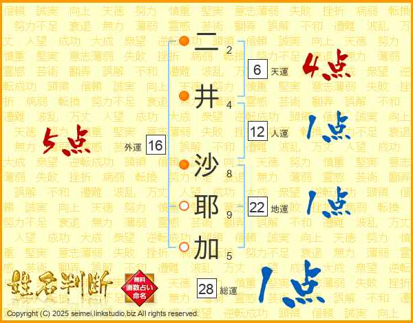 二(2画)井(4画) 沙(8画)耶(9画)加(5画)