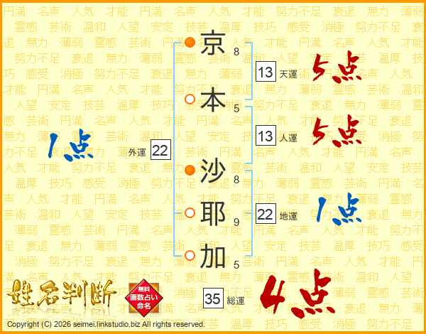 京(8画)本(5画) 沙(8画)耶(9画)加(5画)