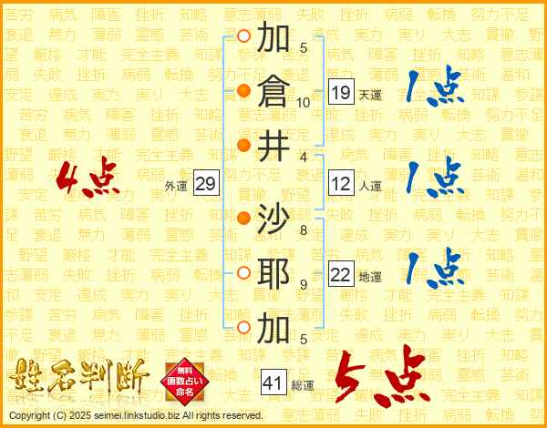 加(5画)倉(10画)井(4画) 沙(8画)耶(9画)加(5画)