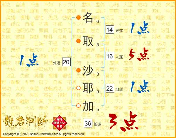 名(6画)取(8画) 沙(8画)耶(9画)加(5画)
