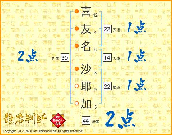 喜(12画)友(4画)名(6画) 沙(8画)耶(9画)加(5画)