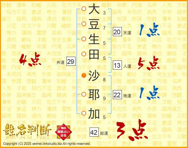 大(3画)豆(7画)生(5画)田(5画) 沙(8画)耶(9画)加(5画)