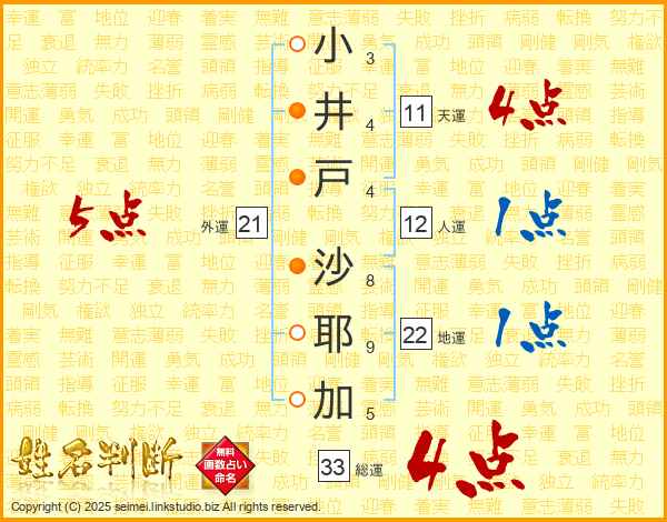 小(3画)井(4画)戸(4画) 沙(8画)耶(9画)加(5画)