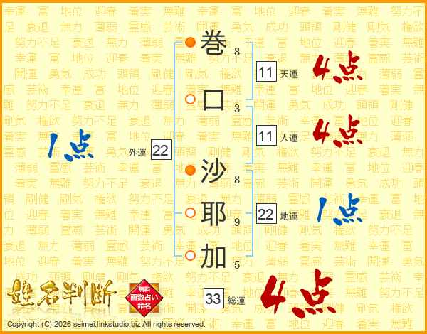 巻(8画)口(3画) 沙(8画)耶(9画)加(5画)