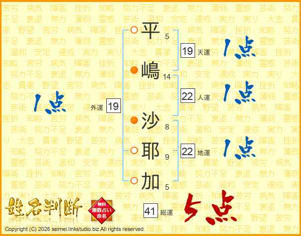 平(5画)嶋(14画) 沙(8画)耶(9画)加(5画)