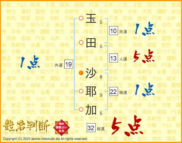 玉(5画)田(5画) 沙(8画)耶(9画)加(5画)