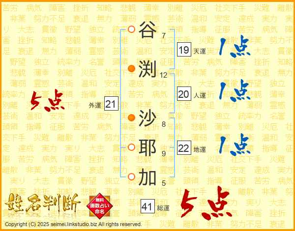 谷(7画)渕(12画) 沙(8画)耶(9画)加(5画)