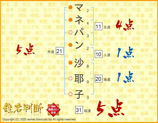 マ(2画)ネ(4画)パ(3画)ン(2画) 沙(8画)耶(9画)子(3画)