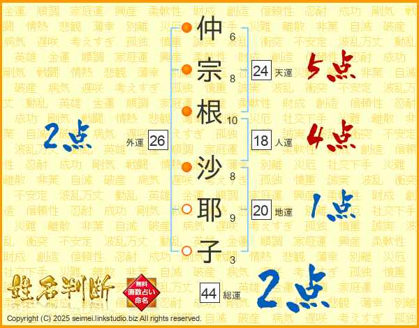 仲(6画)宗(8画)根(10画) 沙(8画)耶(9画)子(3画)