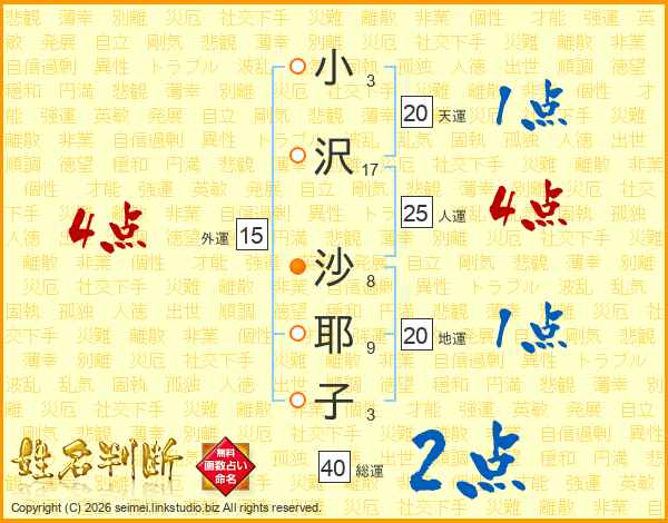 小(3画)沢(17画) 沙(8画)耶(9画)子(3画)
