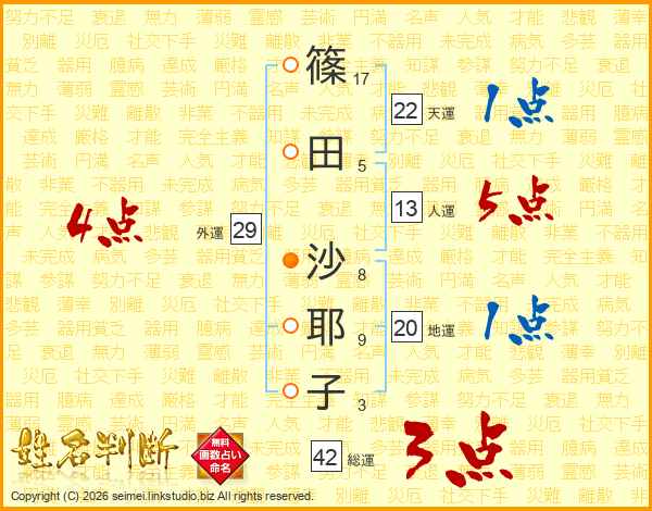 篠(17画)田(5画) 沙(8画)耶(9画)子(3画)