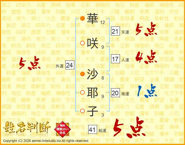 華咲沙耶子さんの総運は41画の5点!