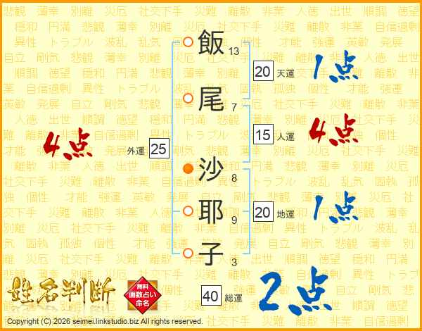 飯(13画)尾(7画) 沙(8画)耶(9画)子(3画)