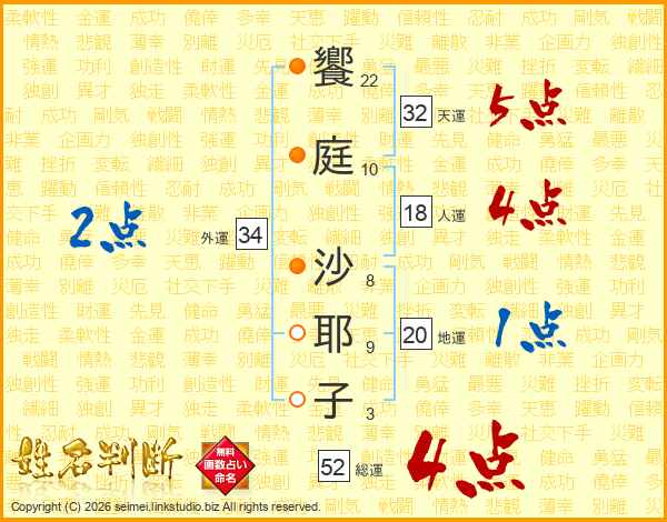 饗(22画)庭(10画) 沙(8画)耶(9画)子(3画)